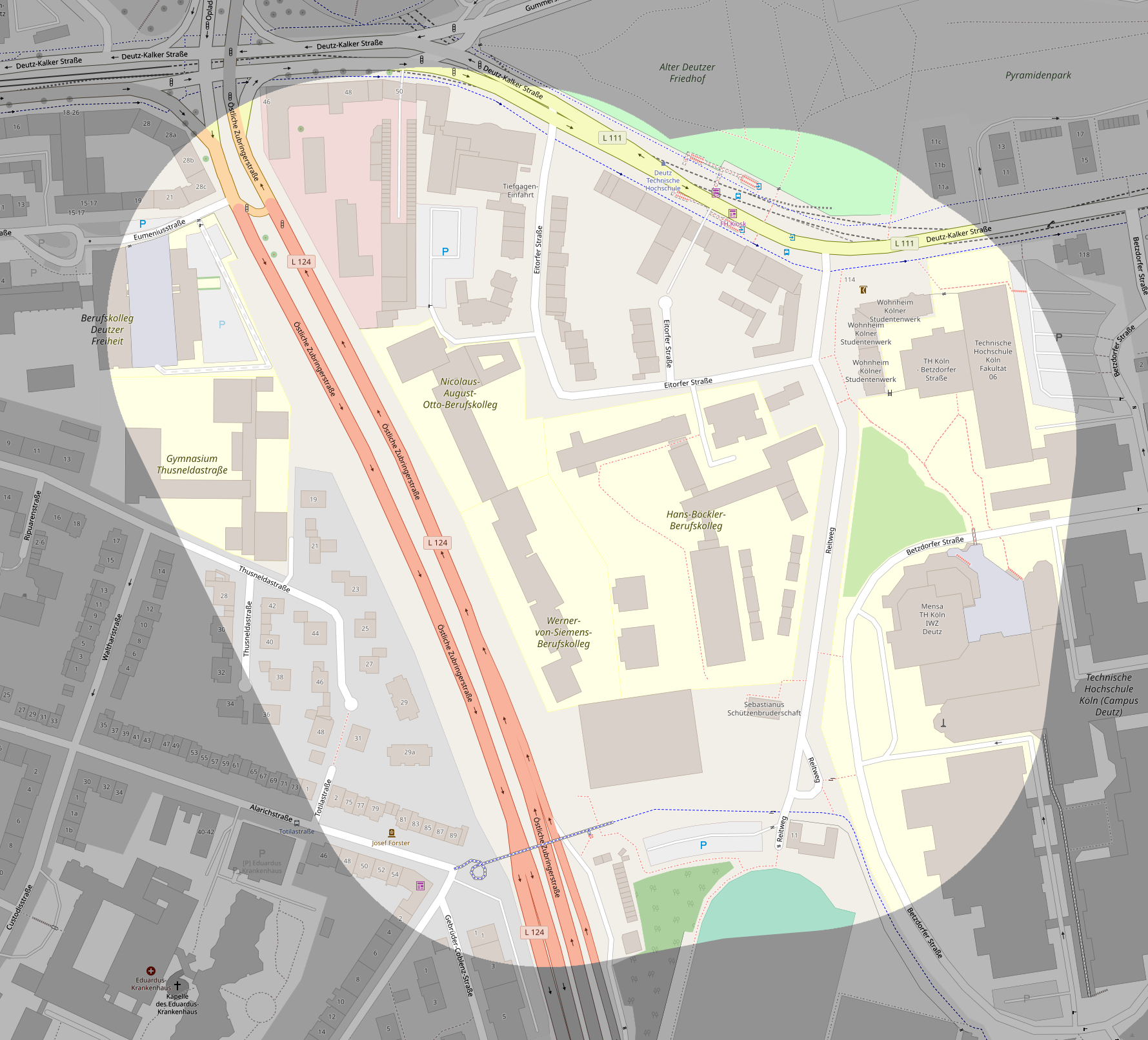 Auf dem folgenden Bild ist der geschätzte 150-Meter-Radius um das Schulgelände hervorgehoben.